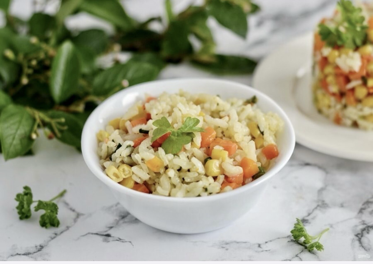 Состав: рис, морковь, кукуруза консервированная, горошек зелёный с/м, грибы шампиньоны, масло сливочное, масло растительное, соль.