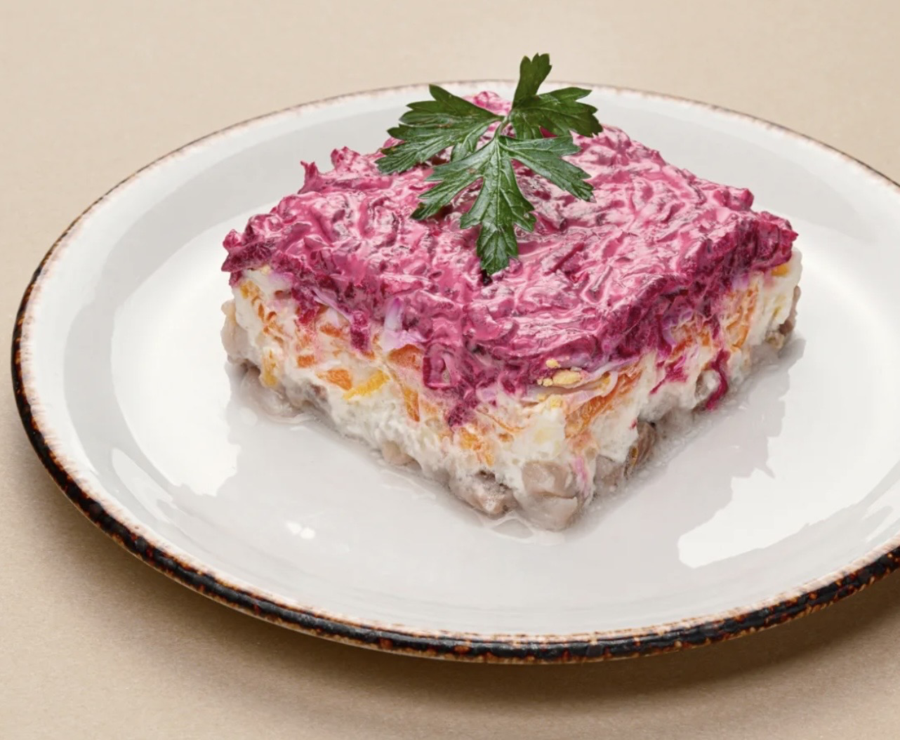 Состав: сельдь малосольная (сельдь, соль, сахар, перец чёрный горошек, укроп семя, лавровый лист), свёкла, морковь, картофель, яйцо, лук репчатый, майонез, зелень.